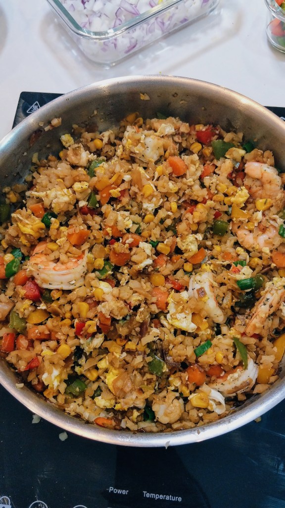 - 2 cups of Cauliflower rice or White jasmine rice (cooked) ( I used two bags of 12 oz Itella Riced Cauliflower from SamsClub) After you cook rice place in the refrigerator.