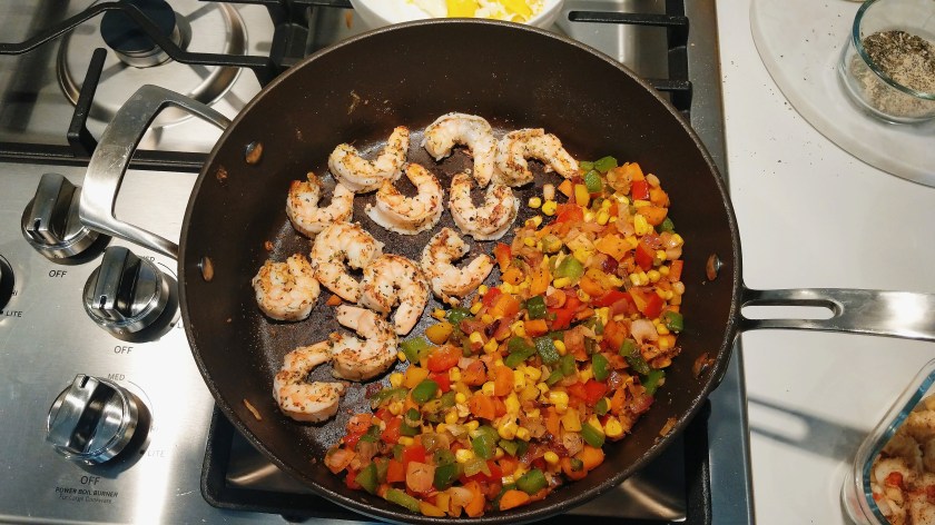 - Push vegetables to the side of pan and add shrimp. Cook shrimp 1-2 minutes. Be sure to flip and not to over cook. Typically when the shrimp is light pink and creates a C shape they are done.