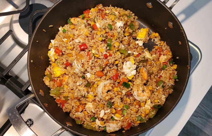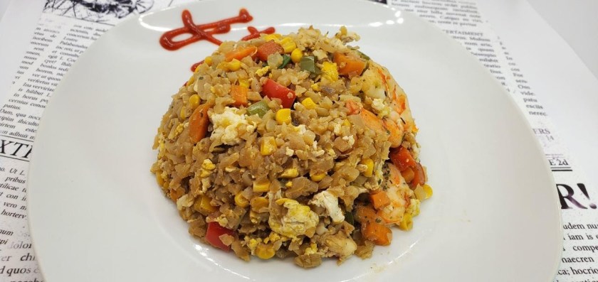 I created this smacking fried rice using cauliflower and jasmine rice. I made a batch using jasmine rice for my husband, but he had the honor of trying both, and he said it was some of the best fried rice he’s ever had!