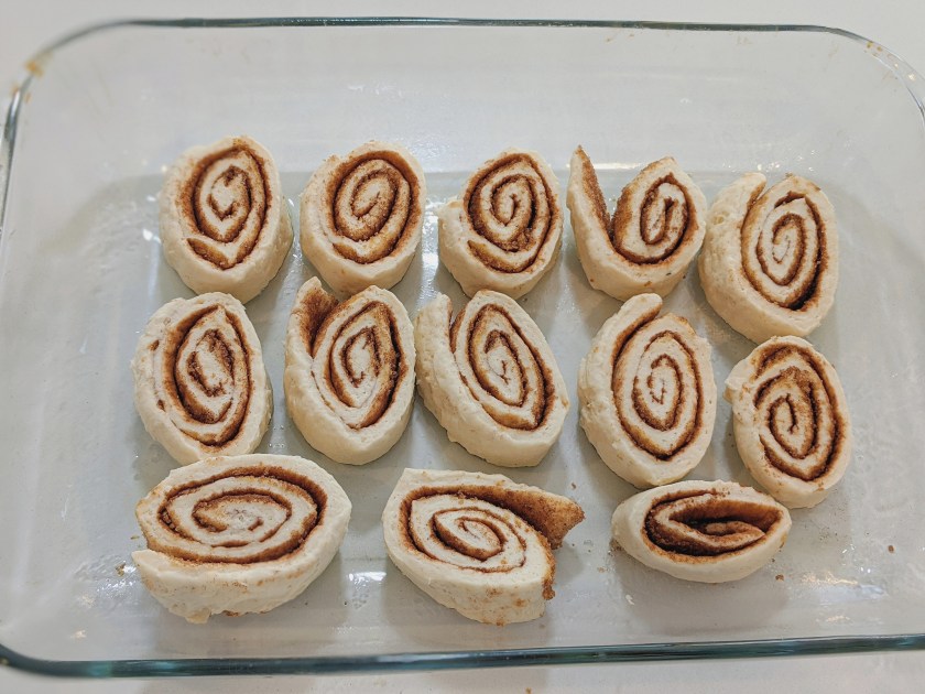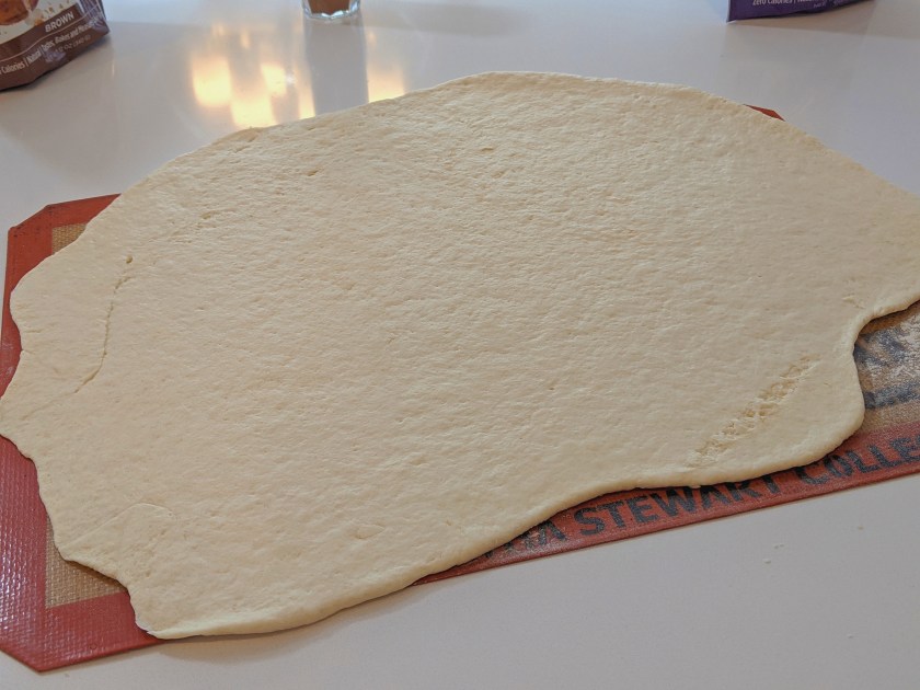 - Place a large piece of parchment paper on a work surface, or use silicone mat and sprinkle with a little flour. Place dough on parchment paper, and roll into a 12 x 9–inch rectangle. Sprinkle evenly with brown sugar and cinnamon, all the way to the edges. Starting with a long edge, roll up dough tightly (use parchment paper to help roll up dough) to form a 12-inch-long roll. Cut roll into 12 (1-inch) slices. Arrange dough slices in an 11 x 7–inch baking dish coated with cooking spray. Season with Molly McButter and Flavor God seasonings to taste.